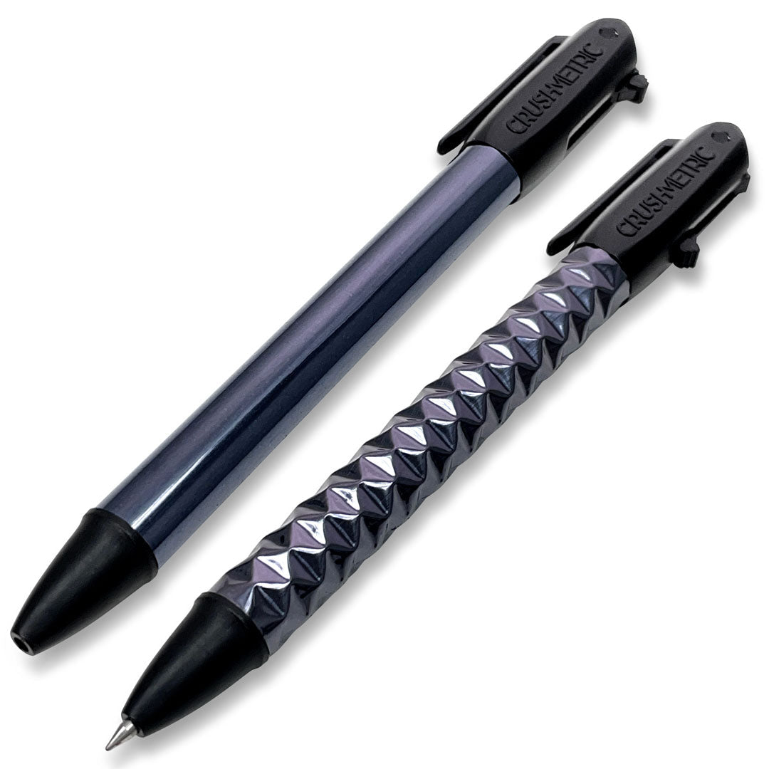 Retractable gel ink pen with shape-changing body. Switches seamlessly between solid/crushed. Operates by switch that activates crushed grip and ink cartridge.
